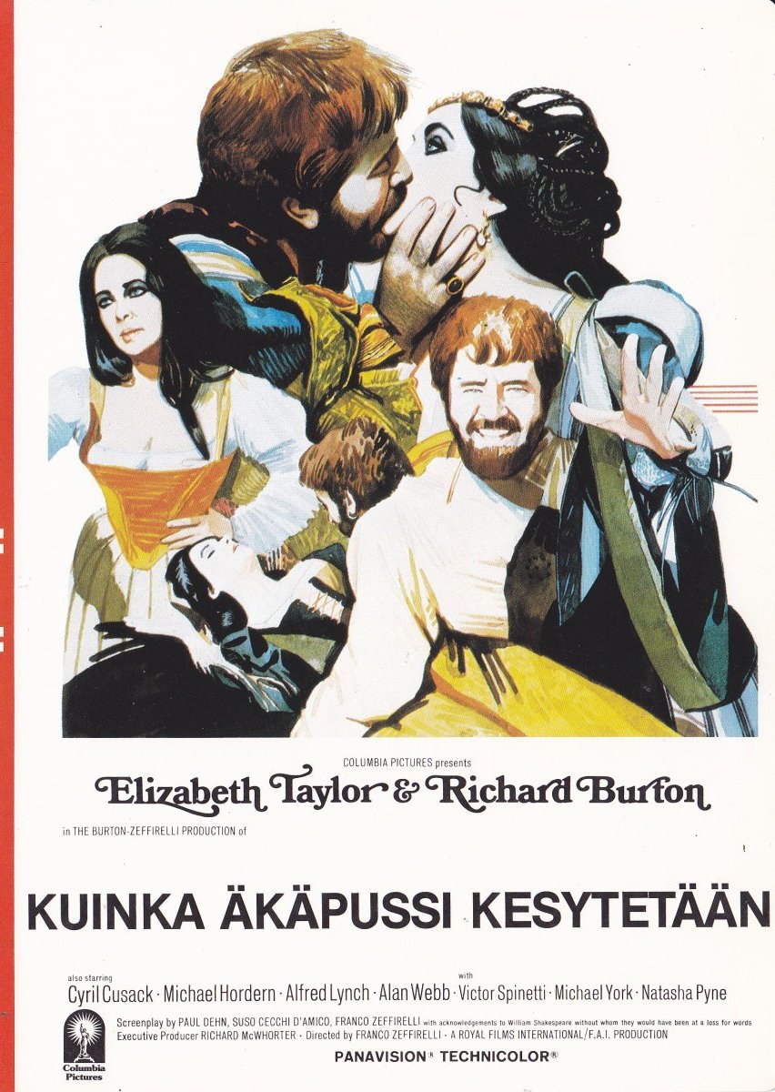 "Elisabeth Taylor ja Richard Burton näyttelevät Katharinaa ja Petruchiota tässä hillittömässä taistelussa miessovinistien ja naisasianaisten kesken. Tämä on klassinen Shakespeare-komedia. Mutta sitä ei ole koskaan ennen näytelty näin (eikä tulla myöhemminkään näyttelemään). Filmi on tehty erityisesti tätä ainutlaatuista paria Taylor-Burton varten. Ja täytyy sanoa, että tämä pari, keskellä aitoa italialaista keskiaikaa, riitelee sellaisella hehkulla että William Shakespeare ei olisi milloinkaan edes uskaltanut uneksiakaan sellaisesta...